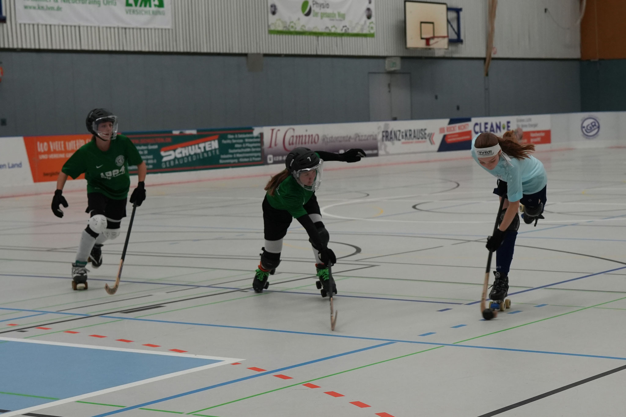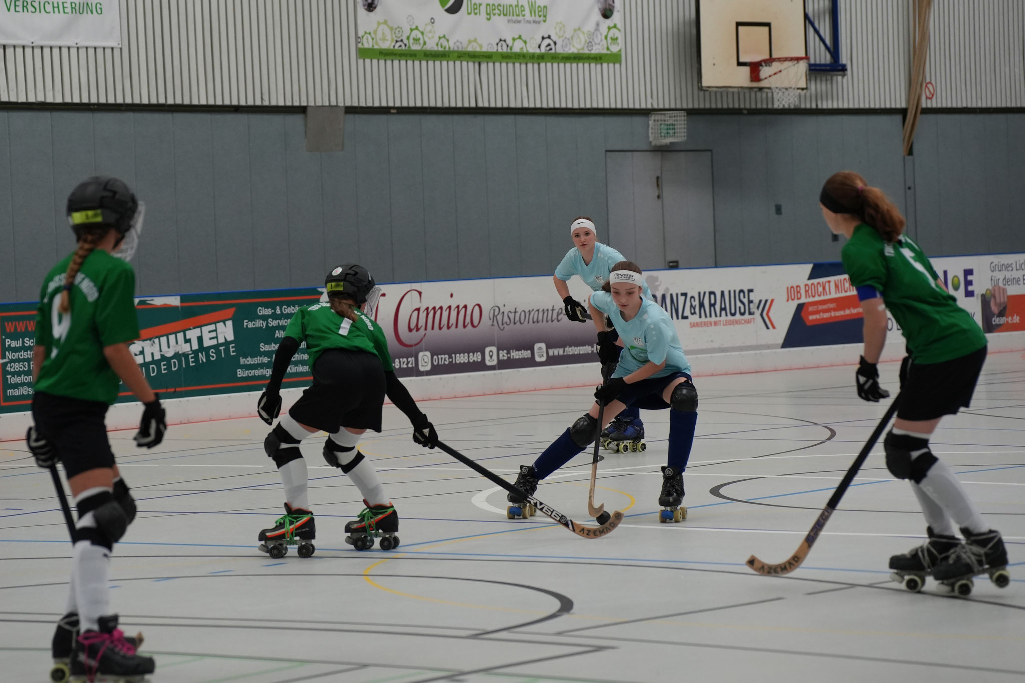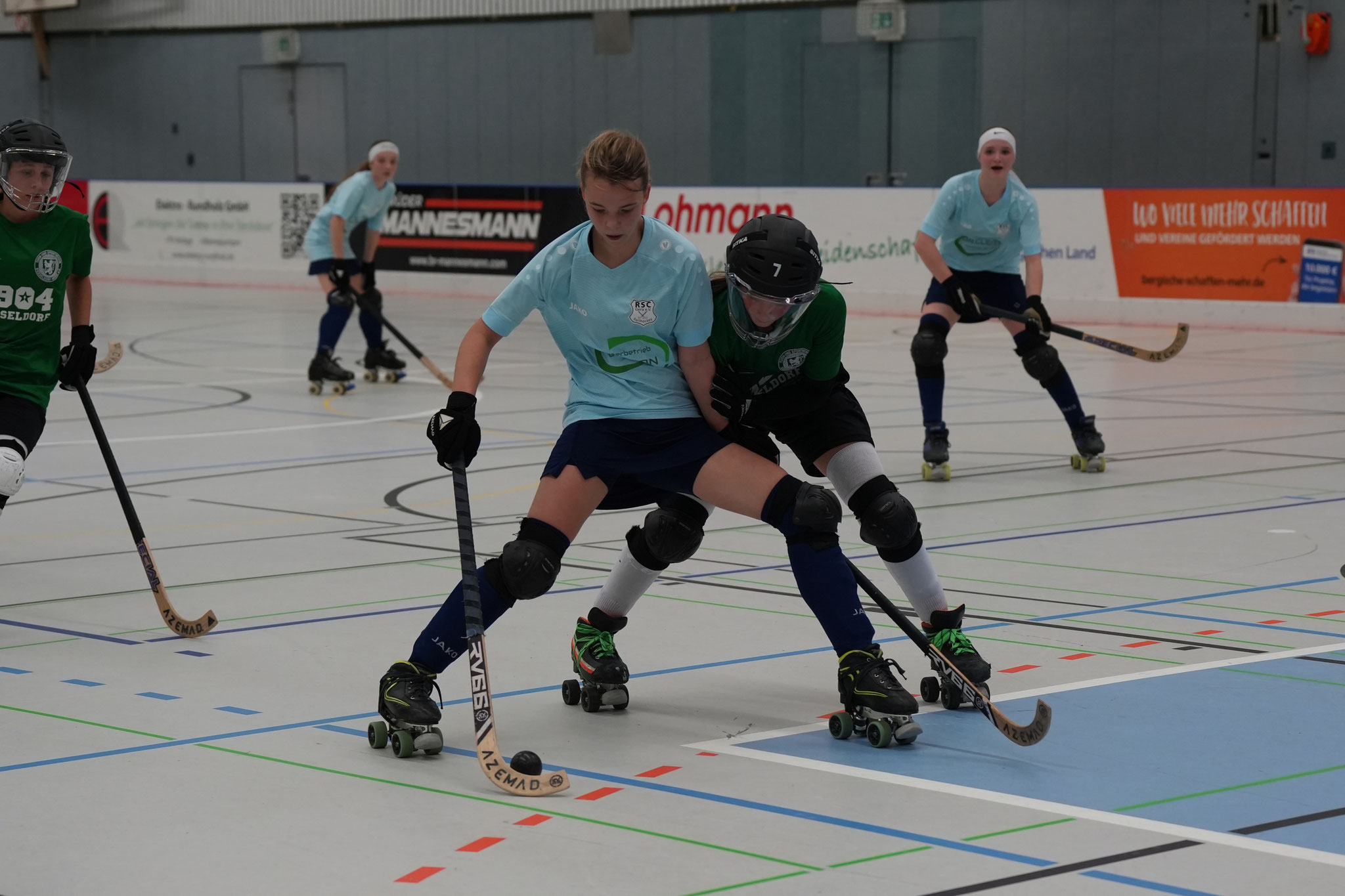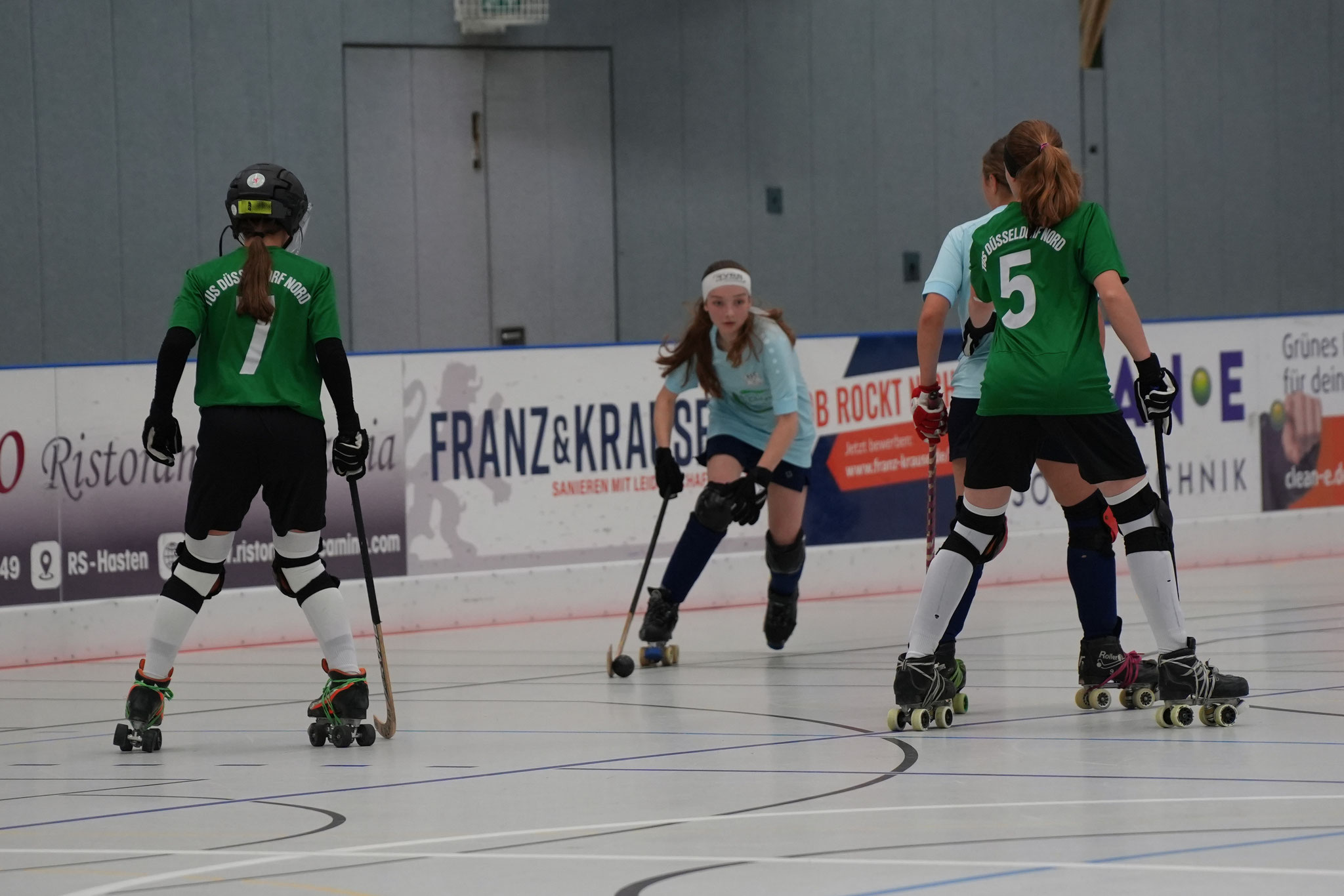 Im ersten Spiel ging es gegen die SG Hüls 1/Darmstadt. Der Beginn war sehr nervös, und es dauerte ein wenig, bis die Mannschaft sich sortiert hatte. So ergab sich eine offene Anfangsphase auf beiden Seiten, bis sich die SG in einen eng stehenden Viererblock zurückzog. Damit begann eine offensiv starke Phase für den RSC, die Finja mit einem schönen Solo krönte. Im Anschluss konnte man sich aber nur selten durch die dicht gestaffelte Abwehr spielen und verlegte sich auf Abschlüsse von außerhalb des Abwehrblocks der SG. Der RSC tat sich jedoch weiterhin schwer: Entweder zielte man zu ungenau, oder die Abpraller konnten nicht genutzt werden. Knapp fünf Minuten vor dem Ende der 1. Halbzeit fand das Spiel ein unschönes Ende. Ein Schussversuch von Finja traf eine Spielerin der SG so unglücklich am Kopf, dass sie vorsorglich ins Krankenhaus gebracht werden musste. Die Spielerinnen auf beiden Seiten waren sichtlich mitgenommen, woraufhin der Schiedsrichter richtigerweise das Spiel abbrach.