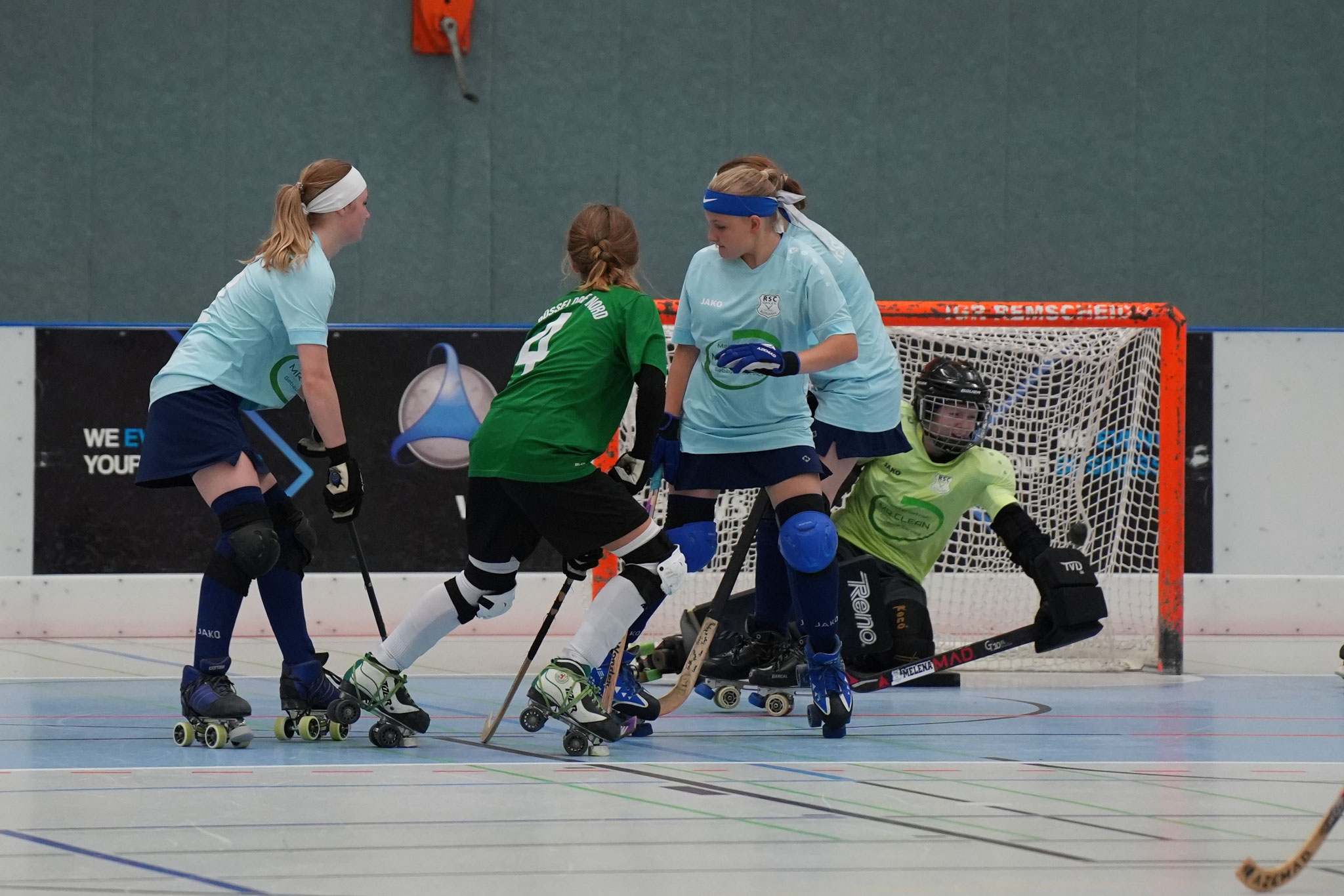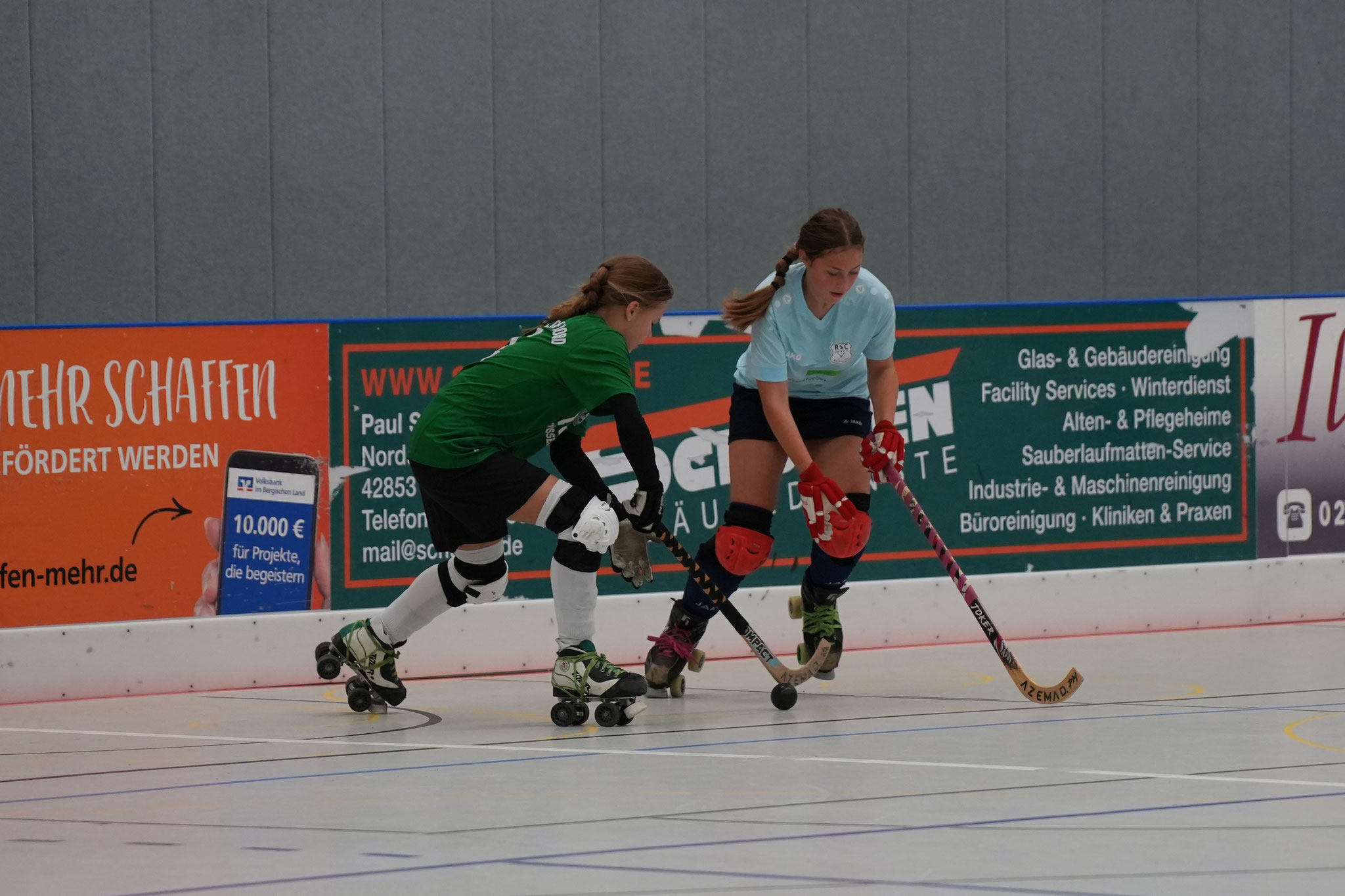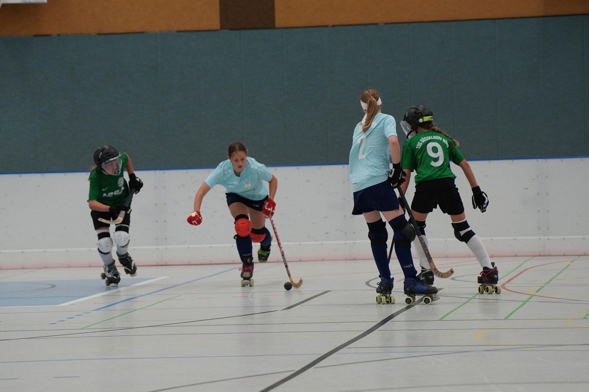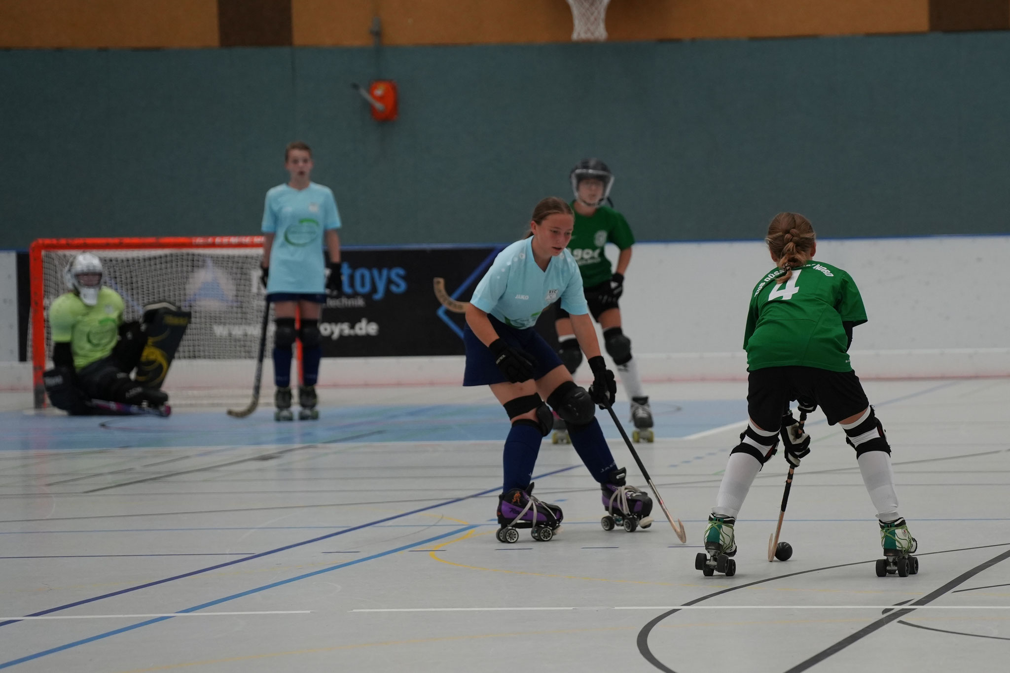 Im ersten Spiel ging es gegen die SG Hüls 1/Darmstadt. Der Beginn war sehr nervös, und es dauerte ein wenig, bis die Mannschaft sich sortiert hatte. So ergab sich eine offene Anfangsphase auf beiden Seiten, bis sich die SG in einen eng stehenden Viererblock zurückzog. Damit begann eine offensiv starke Phase für den RSC, die Finja mit einem schönen Solo krönte. Im Anschluss konnte man sich aber nur selten durch die dicht gestaffelte Abwehr spielen und verlegte sich auf Abschlüsse von außerhalb des Abwehrblocks der SG. Der RSC tat sich jedoch weiterhin schwer: Entweder zielte man zu ungenau, oder die Abpraller konnten nicht genutzt werden. Knapp fünf Minuten vor dem Ende der 1. Halbzeit fand das Spiel ein unschönes Ende. Ein Schussversuch von Finja traf eine Spielerin der SG so unglücklich am Kopf, dass sie vorsorglich ins Krankenhaus gebracht werden musste. Die Spielerinnen auf beiden Seiten waren sichtlich mitgenommen, woraufhin der Schiedsrichter richtigerweise das Spiel abbrach.
