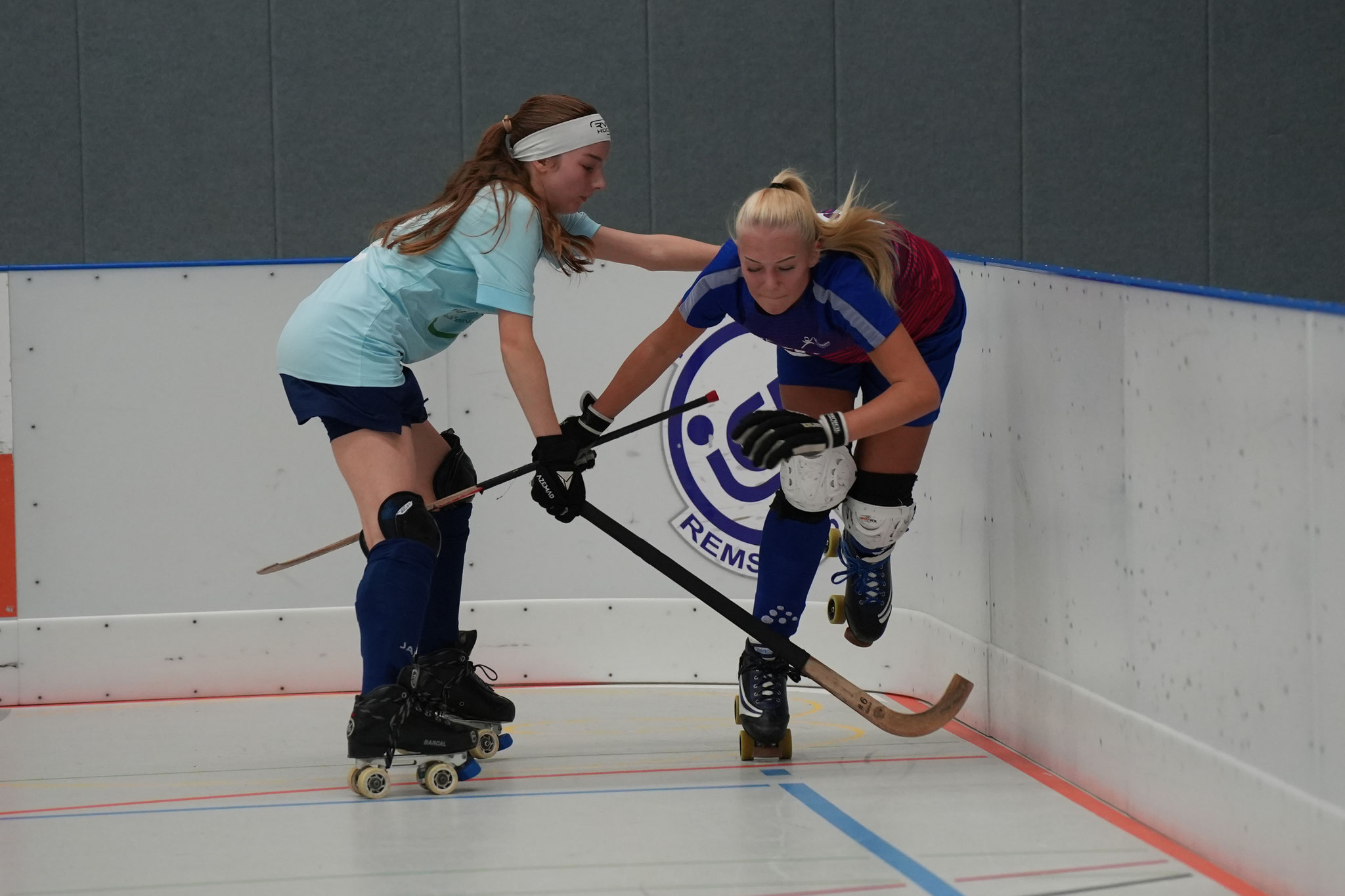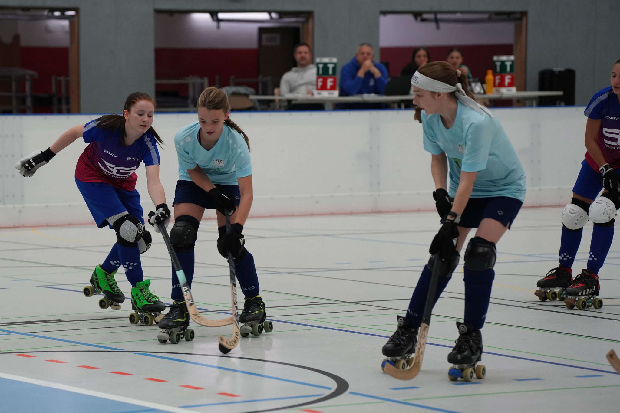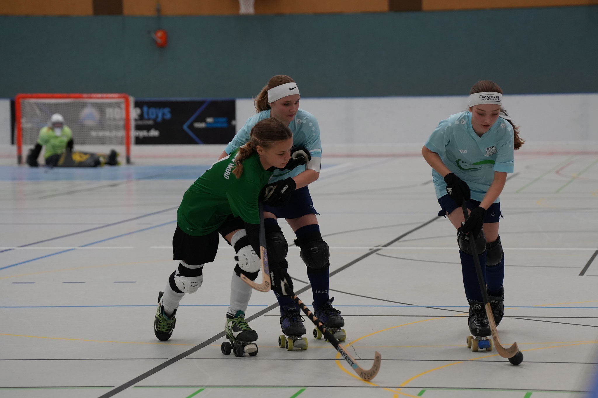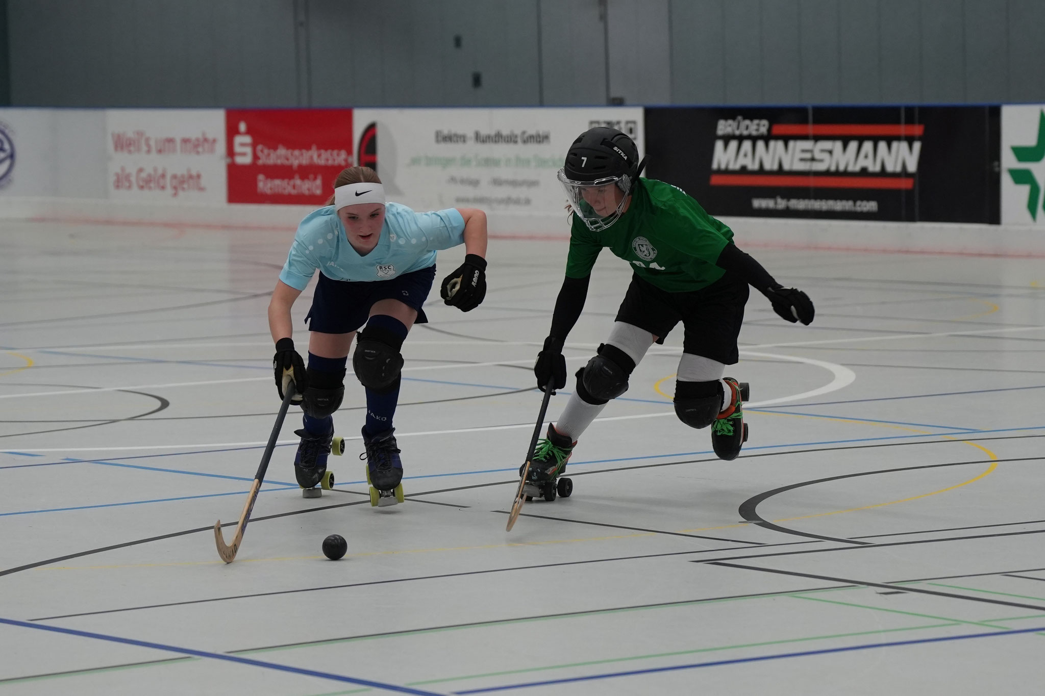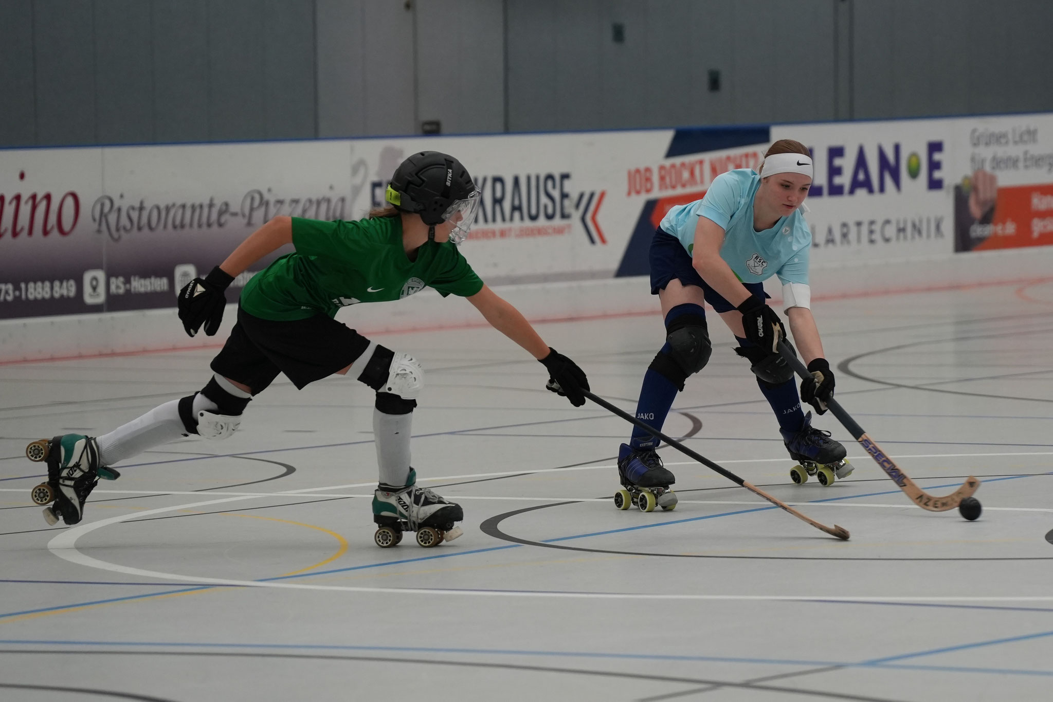 Im ersten Spiel ging es gegen die SG Hüls 1/Darmstadt. Der Beginn war sehr nervös, und es dauerte ein wenig, bis die Mannschaft sich sortiert hatte. So ergab sich eine offene Anfangsphase auf beiden Seiten, bis sich die SG in einen eng stehenden Viererblock zurückzog. Damit begann eine offensiv starke Phase für den RSC, die Finja mit einem schönen Solo krönte. Im Anschluss konnte man sich aber nur selten durch die dicht gestaffelte Abwehr spielen und verlegte sich auf Abschlüsse von außerhalb des Abwehrblocks der SG. Der RSC tat sich jedoch weiterhin schwer: Entweder zielte man zu ungenau, oder die Abpraller konnten nicht genutzt werden. Knapp fünf Minuten vor dem Ende der 1. Halbzeit fand das Spiel ein unschönes Ende. Ein Schussversuch von Finja traf eine Spielerin der SG so unglücklich am Kopf, dass sie vorsorglich ins Krankenhaus gebracht werden musste. Die Spielerinnen auf beiden Seiten waren sichtlich mitgenommen, woraufhin der Schiedsrichter richtigerweise das Spiel abbrach.