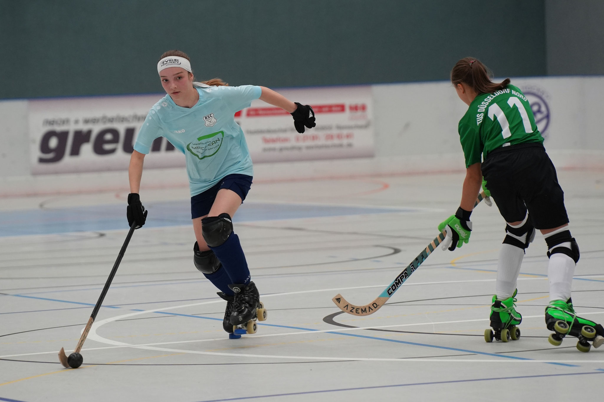 Im zweiten Spiel des Tages für den RSC ging es gegen die starken Düsseldorferinnen des TuS. Von Anfang an hatten die RSClerinnen in der Verteidigung alle Hände voll zu tun. Nur selten fand man, meist durch Einzelaktionen, Entlastung nach vorne. Torchancen waren daher Mangelware, aber die Abwehr um Torhüterin Lara hielt bis zum Halbzeitpfiff den Kasten sauber, sodass es mit einem 0:0 in die Pause ging.